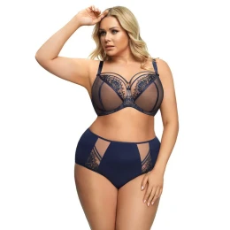 Kalhotky jsou vyrobené z jednobarevného tmavě modrého mikrovlákna. Přední díl modelu zdobí vsadky z transparentní síťoviny s efektní krajkou a páskami. Zadní díl kalhotek lemuje tyl.
