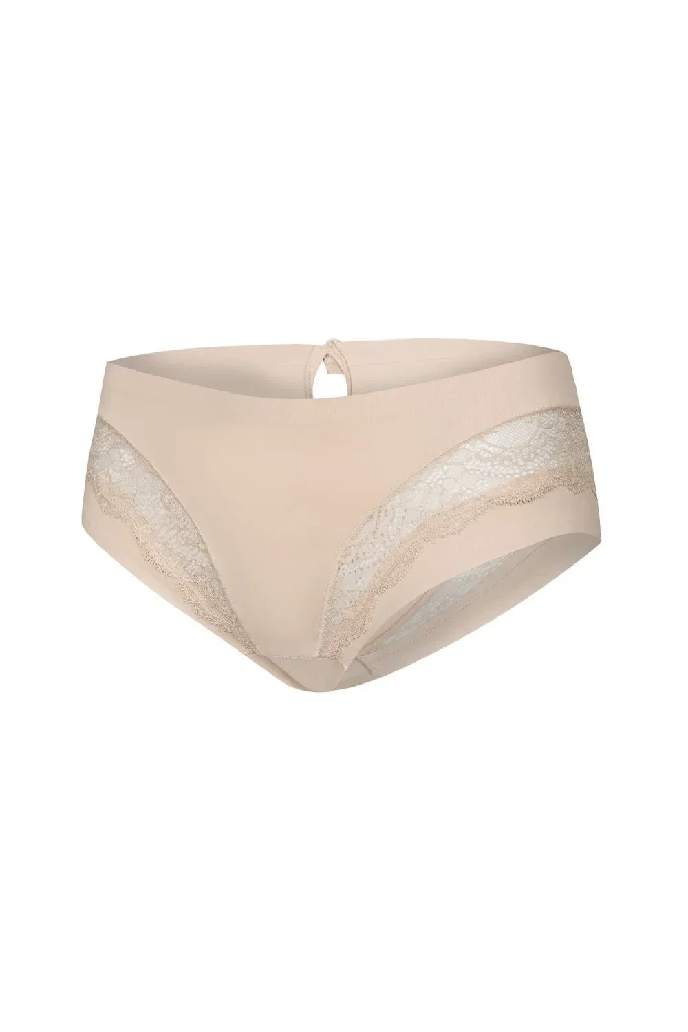 Dámske nohavičky Kiss Julimex - béžová farba - klasický strih - na bokoch majú krajku s výšivkou - sed je zosilnený látkou - na zadnej strane decentný výstrihMateriálové zloženie: 89% polyamid + 10% elastan + 1% bavlna
