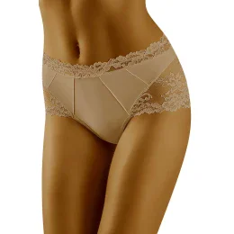 Dámske béžové nohavičky Luxa Wol-bar - béžová farba - vyrobené z mikrovlákna - nohavičky sú zdobené kvetinovou čipkou - zvislé švy na prednej časti opticky zoštíhľujú postavu - čipka obopína boky a prechádza do zadnej časti, čím dodáva celému modelu rafinovaný vzhľad Zloženie materiálu: 83% polyamid + 17% elastan
