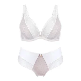 Přední díl kalhotek je ušitý z bílého jemného materiálu našitého na béžovou síťovinu. Boky a zadní díl modelu lemuje měkká krajka. Vrchní část tvoří jemné bílé mikrovlákno.
