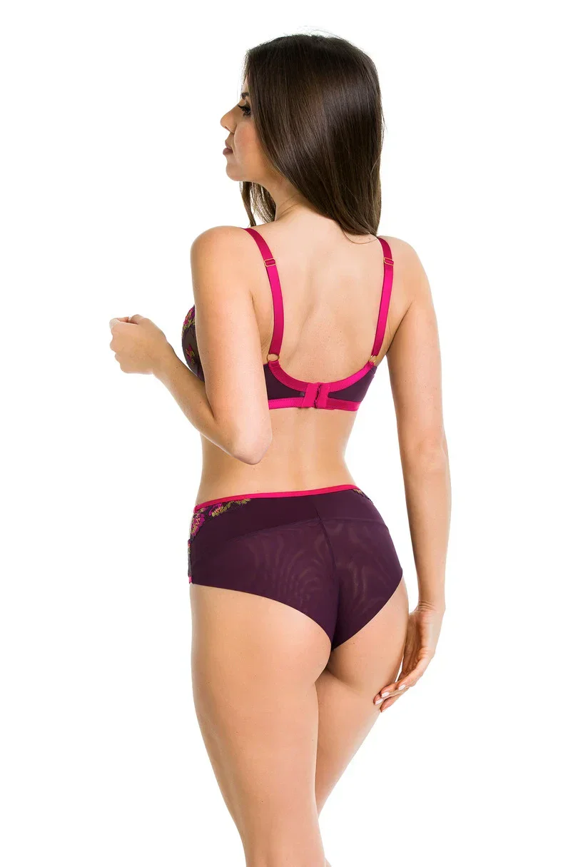 Přední díl kalhotek zdobí pěkná výšivka. Zadní díl modelu je ušitý ze dvojitého tylu ve fialové barvě. Okraje jsou olemované lemovkou v amarantové barvě.