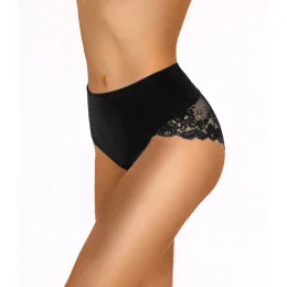 Kalhotky mají plný vysoký střih. Pas modelu je ozdobený saténovými mašličkami. Zadní díl kalhotek je krajkový.