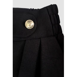 Design těchto lehkých kalhot si zamilujete - široké nohavice se záhyby, částečně elastický pas a ozdobné zlaté knoflíky vpředu.