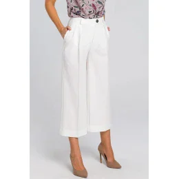 Volné jednobarevné cullottes vylepší každý outfit, a to jak ten méně, tak i ten elegantnější. Mohou úspěšně nahradit elegantní sukni nebo být náhradou za klasické džíny nošené každý den. Kalhoty se zipem a knoflíky.