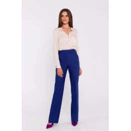 Elegantné dámske tkané nohavice s rozšírenými nohavicami v spodnej časti, ktoré dodávajú siluete ľahkosť a predlžujú nohy. Lisovaný okraj zdôrazňuje ich klasický a rafinovaný charakter, ideálne do práce aj na formálne príležitosti. Nohavice majú vysoký pás, ktorý krásne zvýrazňuje pás, zatiaľ čo krytý zips na zadnej strane zabezpečuje hladké a diskrétne zapínanie. Navrhnuté a ušité v Poľsku, spájajú vynikajúce spracovanie s módnym, ženským strihom.