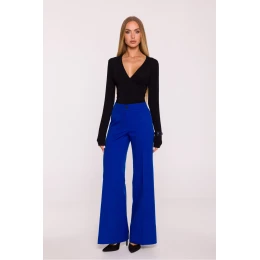 Klasické dámské kalhoty vyrobené z hladkého pánského materiálu s matným povrchem jsou elegantní a nadčasovým návrhem pro mnoho stylizací. Materiál si udržuje strukturu a žehlené lem na nohavicích dodává celku sofistikovaný charakter. Model s středním pasem se přizpůsobuje pasu a bokům, zatímco široké nohavice od stehna dolů zajistí pohodlné nošení a volnost pohybu. Zapínání na knoflík a skrytý zip vpředu zaručuje pohodlí, zatímco boční kapsy přidávají funkčnost. Kalhoty sahají až na zem, co v kombinaci se širokými nohavicemi opticky prodlužuje postavu a zdůrazňuje elegantní charakter celého outfitu. Bez podšívky zůstává model lehký a pohodlný na nošení. Navrženo a vyrobeno v Polsku pro ženy, které oceňují klasiku, pohodlí a dokonalé provedení.