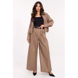 Elegantné a pohodlné palazzo nohavice vyrobené z kvalitnej ekokože (zmes polyesteru a polyuretánu). Model so širokými nohavicami a vysokým pásom krásne zvýrazňuje pás a zároveň poskytuje voľnosť pohybu. V páse je vsadená pružná guma, vďaka ktorej nohavice dokonale sedia na postave. Okrem toho majú zapínanie na opasok, ktorý pomáha zvýrazniť postavu a dodať celku elegantný akcent. Model má bočné vrecká a hladký povrch materiálu, ktorý mu dodáva moderný a minimalistický charakter. Je ideálnou voľbou pre ležérny štýl, vhodný na každodenný život aj do práce, ktorý zaručuje pohodlie a štýlový vzhľad počas celého dňa.