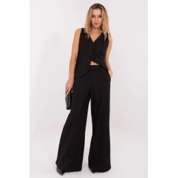 Elegantní dámské široké nohavice typu palazzo jsou navrženy pro ženy, které ocení elegantní styl spojený s pohodlím. Skvěle se hodí na každodenní nošení, do práce i na formální události, dodávají outfitům lehkost a eleganci. Pruhovaný vzor jemně zvýrazňuje postavu a podtrhuje moderní charakter modelu. Vyrobené z kvalitní směsi nylonu, viskózy, polyesteru a elastanu jsou lehké, pružné a příjemné na nošení. Vysoký pas krásně zdůrazňuje pas, široké nohavice typu palazzo dodávají celkovému vzhledu elegantní a uvolněný charakter. Model je vybaven zipem a knoflíky, které zajistí stabilní a pohodlné padnutí. Boční kapsy dodávají funkčnost, zachovávajíce přitom elegantní vzhled. Jedná se o kalhoty, které spojují eleganci, pohodlí a nadčasový střih, ideální pro vytváření stylových ženských outfitů na různé příležitosti.