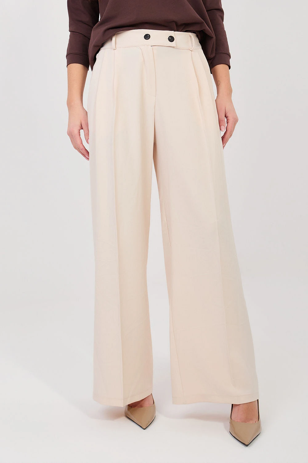 Tieto elegantné dámske nohavice so širokými nohavicami sú skvelou voľbou na každodenné nosenie, do práce aj na slávnostné udalosti. Sú vyrobené z kvalitného polyesteru s prídavkom elastanu, poskytujú pohodlie pri nosení, odolnosť a jemnú elasticitu, ktorá umožňuje voľnosť pohybu. Hladký materiál im dodáva klasický a nadčasový charakter. Model s vysokým pásom krásne zvýrazňuje pás a opticky predlžuje postavu, zatiaľ čo dlhé, široké nohavice dodávajú štýlu ľahkosť a eleganciu. Nohavice sa zapínajú na zips a gombíky, čo zaručuje dobré prispôsobenie. Praktické bočné vrecká zvyšujú funkčnosť a jednoduchosť používania. Skvele sa hodia ku košeli a saku, ako aj k ležérnejšej blúzke. elastan 10 %