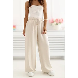 Dámské kalhoty typu wide leg jsou pohodlnou a stylovou volbou na každý den. Model s širokými, dlouhými nohavicemi se krásně tvaruje podle postavy, poskytuje volnost pohybu a módní, lehce nonšalantní vzhled. Hladký vzor činí kalhoty mimořádně univerzální a snadné na stylování, skvěle ladí jak s každodenními, tak s více ženskými kousky oblečení. Vysoký pas zdůrazňuje pas, a šňarování v pasu umožňuje individuální přizpůsobení a zvyšuje komfort nošení. Vyrobené z kombinace viskózy a polyamidu, kalhoty jsou lehké, příjemné na dotek a dobře padnou na tělo. Chybějící kapsy zdůrazňují jejich minimalistický charakter a dodávají celku elegantního zakončení. Je to ideální volba pro ženy, které ocení pohodlí, jednoduchost a nadčasový styl ve svých každodenních stylizacích. Poznámka: Velikost na štítku M/L, ale model vypadá menší, odpovídá velikosti S/M (podhodnocený).