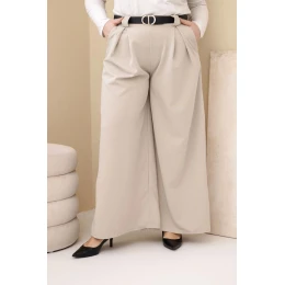 Dámské kalhoty Plus Size viskózové s širokou nohavicí a páskem béžové