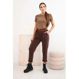 Dámské kalhoty s páskem pruhované hnědé
