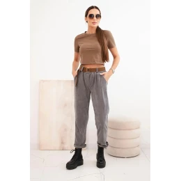 Dámské kalhoty s páskem v pruhy tmavě šedé