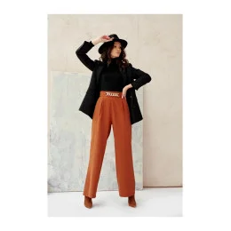Dámské kalhoty s širokými nohavicemi a ozdobnými řetízkovými detaily jsou vyrobeny z kvalitní tkaniny, která dýchá a zajišťuje pohodlné nošení. Kalhoty mají široké nohavice zvonového střihu. Mají také vysoký náplet pro štíhlejší siluetu a ozdobný řetízkový pásek. Zapínají se vzadu na zip. Výrobek je vyroben a ušit v Polsku.