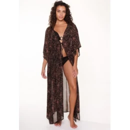 Dámske kimono značky LingaDore. Kimono je dlhé, vzdušné, polopriehľadné. Okolo pása je všitá gumička, ktorá je vpredu zakončená tenkou šnúrkou. Po stranách sú vysoké rozparky.