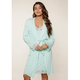 Urobte si leňošenie bez námahy elegantným. Objavte šarm a eleganciu tohto kimona z bambusu. Kimono má dlhé rukávy, vhodný pás s čipkovanými detailmi a dĺžku po kolená. A samozrejme, je mimoriadne pohodlné. Ideálna voľba na štýlové a pohodlné chvíle oddychu.
