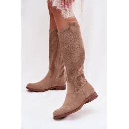 Dámské kozačky s krajkovým vzorem na plochém podpatku model 21998027 Béžové - S.Barski