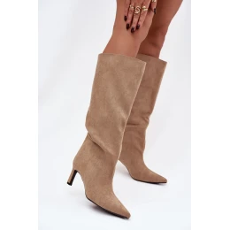 Dámské kozačky z eko semiše nazouvací na jehlovém podpatku béžové model 21770290 - Boto