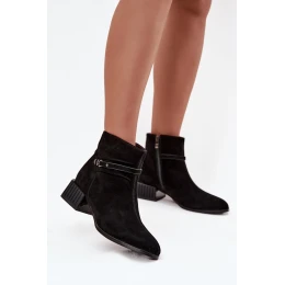 Elegantní dámské semišové kotníkové boty představují spojení elegance a pohodlí. Model na stabilním kockovém podpatku zajišťuje pohodlí při nošení a vyhřívané vnitřní prostředí je ideální na chladnější dny. Boty se zapínají na zip, což usnadňuje obouvání. Dodává jim kouzlo ozdobný pásek a prošití vedoucí po celé délce přední části límce, které zdůrazňují jejich stylový, ženský charakter. Ideální volba pro ženy, které oceňují eleganci v každodenním životě – vhodné do práce, na schůzky a na běžné nošení. Při výběru velikosti se řiďte tabulkou velikostí. Při výběru velikosti se řiďte tabulkou velikostí.