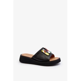 Tieto dámske šľapky sú vyrobené z prírodnej kože. Tento model má na prednej strane ozdobné zdobenie. Šľapky sú osadené na platforme a mäkkom klinčeku. Vďaka mäkkej stielke z prírodnej kože sa topánky pohodlne nosia. Tieto zaujímavo riešené šľapky sa určite budú hodiť k mnohým štýlom! Musíte ich mať vo svojom letnom šatníku! Pri výbere veľkosti sa riaďte tabuľkou veľkostí.