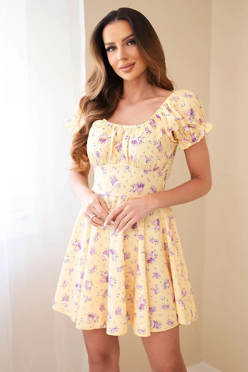 Dámske kvetinové šaty s balónovými rukávmi a elastickým pásom žlté