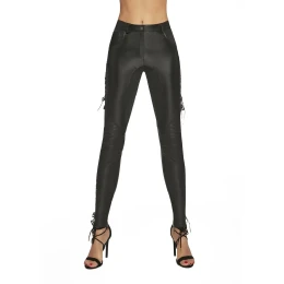 Luxusní přiléhavé legíny BRITTANY, elastické, skvěle padnoucí. Všivky z ekokůže. Na bočních stranách zajímavě působící šněrování. Kapsy vpředu i vzadu. Síla vlákna 200 DEN. Nepřehlédnutelný model.