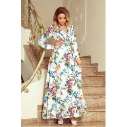 Dámske maxi šaty s volánikom, výstrihom a so vzorom farebných ruží a svetle modrých vtáčikov model 7404387