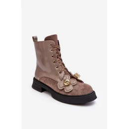 Dámské boty byly vyrobeny z vysoce kvalitní ekologické kůže. Byla umístěna na plochém podpatku a platformě. Na přední straně mají šněrování, zatímco na straně jeho kotníku je zip, který usnadňuje obouvání. Střed byl izolován milým kožešinovým obložením. Navíc tento model byl ozdoben květinami z látky a umělého materiálu. Tento model určitě využijete v mnoha stylizacích! Při výběru velikosti se řiďte tabulkou velikostí.