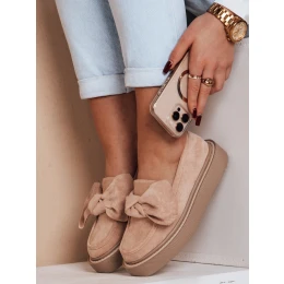 Półbuty damskie typu mokasyny na grubej platformie. Model wykonany z zamszowej eko skóry oraz eko skórzanej wkładki. Nosek zdobiony kokardką. Uniwersalne buty, które podkreślą każdą stylizację, od codziennych po bardziej szykowne.