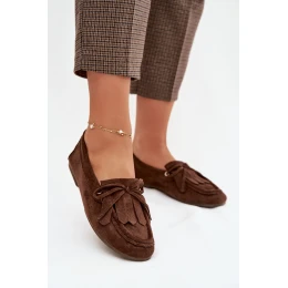 Dámské mokasíny vyrobené z měkkého eko semiše, krásně vypadají na noze. Vepředu jsou dekorativní třásně a ozdobné šněrování ve tvaru mašle, které dodávají jemný, ženský charakter. Vnitřek je potažen měkkou vložkou z eko kůže, díky čemuž mokasíny poskytují pohodlí i během dlouhého dne. Plochá podrážka je činí ideálními jak do práce, tak na procházky či setkání s přáteli. Při výběru velikosti se řiďte tabulkou velikostí.