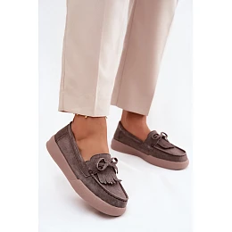 Dámské mokasíny z přírodního semiše s mašlí a třásněmi model 22126237 hnědé - VINCEZA