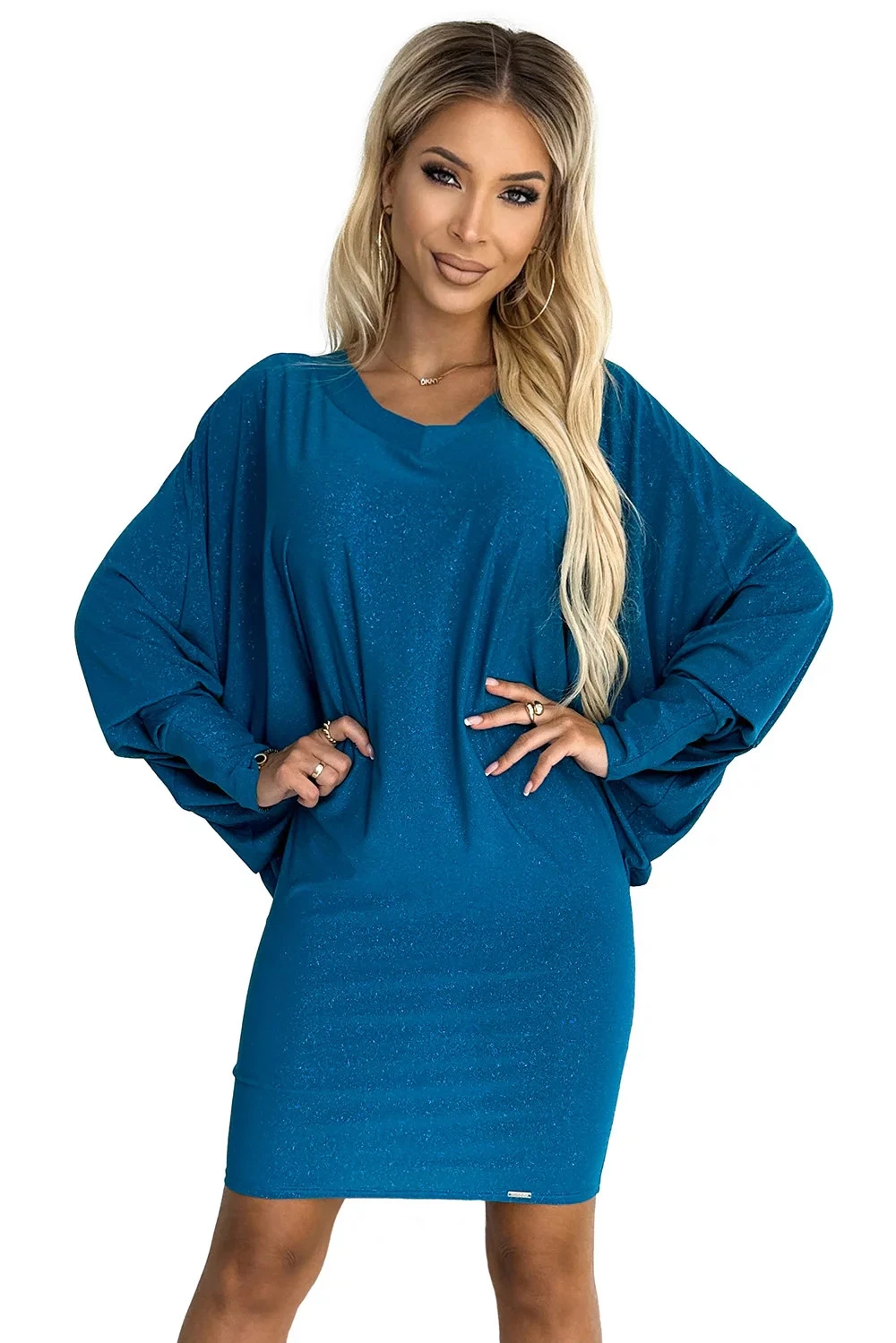 Šaty sú vyrobené z elastického materiálu s brokátom. Model sa dá nosiť ako šaty alebo ako blúzka. Tieto šaty Numoco sú poľským výrobkom a sú dostupné v morskej farbe.