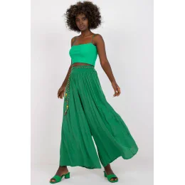 Viskózové nohavice s vysokým pásom a elastickým pásom. Nohavice so širokými nohavicami, ozdobný opasok na zaviazanie.