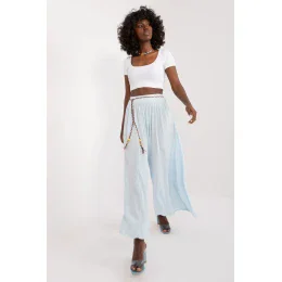 Dámske látkové nohavice typu palazzo, ideálne na každodennú štylizáciu. Sú vyrobené z ľahkej a priedušnej viskózy a poskytujú pohodlie a voľnosť pohybu. Široké, vzdušné nohavice im dodávajú elegantný a uvoľnený charakter, zatiaľ čo vysoký pás zvýrazňuje postavu a zároveň zabezpečuje pohodlie. Nohavice majú opasok na zaväzovanie, ktorý umožňuje úpravu v páse, a vďaka hladkému materiálu sú univerzálne a ľahko sa kombinujú s rôznymi vrchmi v šatníku. Skvelá voľba na každodennú, ale aj elegantnejšiu štylizáciu.