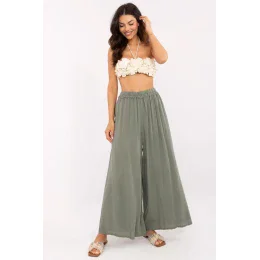 Dámske látkové nohavice, ideálne na každodenné bežné nosenie. Sú vyrobené z ľahkej a priedušnej viskózy a poskytujú pohodlie a voľnosť pohybu. Široké nohavice im dodávajú elegantný, ale voľný strih. Vysoký pás zvýrazňuje pás, zatiaľ čo elastický pás zabezpečuje pohodlné nosenie. Vďaka hladkému materiálu sú nohavice univerzálne a ľahko sa štylizujú. Skvelá voľba pre ženy, ktoré ocenia pohodlie a štýlový vzhľad.