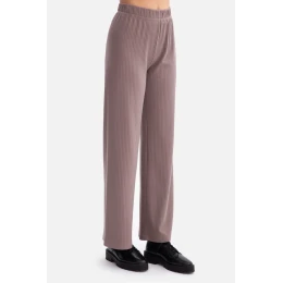 Kalhoty pro dámy vyrobené z pruhované pleteniny o gramáži 250 g, která je měkká, elastická a příjemná na nošení. Model bez kapes a podšívky s praktickým gumovým páskem v pase, který zajistí pohodlí a přizpůsobení se postavě. Volný střih, pletené kalhoty jsou přizpůsobeny v pasu a bocích a dále se volně skládají, což zaručuje pohodlí a lehkost. Dlouhé, rovné nohavice mírně se rozšiřující ke spodní části zúžují postavu a dodávají celku eleganci. Střední výška pasu zajišťuje, že kalhoty dobře sedí a zdůrazňují pas, a plná délka až na zem jim dodává moderní, prodlužující efekt nohou. Navrženy a vyrobeny v Polsku z pleteniny vyrobené v Lodži, je to spojení pohodlí, kvality a nadčasového stylu.