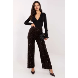 Elegantné látkové nohavice s flitrami, ktoré sú určené na špeciálne príležitosti, ako sú spoločenské udalosti a večierky. Nohavice sú vyrobené z kombinácie polyesteru a elastanu a zaručujú pohodlné nosenie a jemný lesk vďaka aplikácii flitrov, ktoré im dodávajú výrazný nádych. Model s rovnými nohavicami a vysokým pásom jemne predlžuje postavu. Absencia zapínania a vreciek dodáva celkovému vzhľadu hladký, minimalistický vzhľad a mäkká podšívka zaručuje pohodlie pri nosení. Tieto nohavice sú ideálnou voľbou, ak chcete svojmu outfitu dodať elegantný, očarujúci akcent.