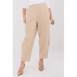 Pohodlné a štýlové látkové nohavice s ležérnym charakterom, ideálne na každý deň a do práce. Sú vyrobené zo zmesi viskózy, nylonu a elastanu, poskytujú pohodlie, pružnosť a elegantné rozloženie materiálu. Vďaka hladkému, jednotnému vzoru sú univerzálne a ľahko sa kombinujú s mnohými štýlmi. Model má vysoký pás, ktorý krásne zvýrazňuje pás, a elastický pás zabezpečuje ideálne prispôsobenie a pohodlie pri nosení, nohavice sú bez potreby zapínania. Zúžené nohavice dodávajú siluete ľahkosť a opticky ju predlžujú. Na zvýšenie funkčnosti sú nohavice vybavené bočnými vreckami, ktoré zostávajú praktické a zároveň nenarúšajú minimalistickú líniu celého modelu. Pohodlné, praktické a štýlové, ideálne na každodenné moderné štylizácie.