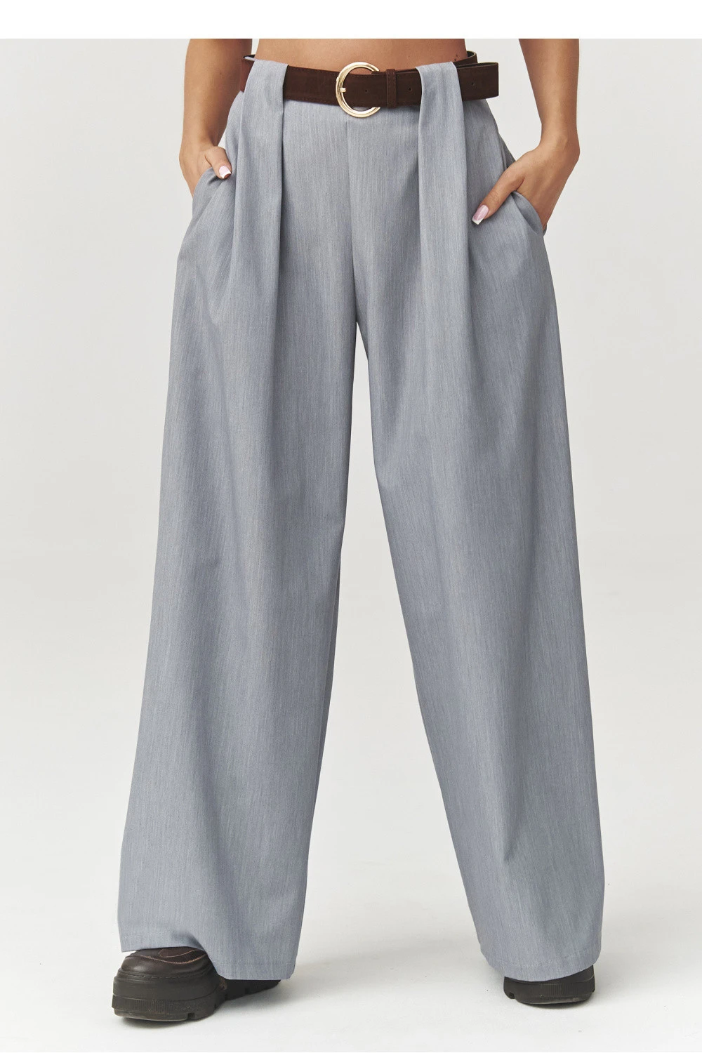Dodajte svojmu šatníku nádych elegancie a pohodlia s našimi nohavicami s vysokým pásom a širokými záhybmi. Je to skvelá voľba pre ženy, ktoré ocenia štýl a pohodlie. Nohavice sú vyrobené z kvalitnej tkaniny, ktorá sa krásne skladá a je ideálna na každodenný aj formálny styling. Vďaka širokým nohaviciam a jemným záhybom nohavice opticky predlžujú postavu a ozdobný opasok so sponou im dodáva moderný charakter. Skvele sa kombinujú s košeľou, sakom alebo objemným svetrom. Je to ideálny model do práce aj na spoločenské stretnutia, ktorý vsádza na univerzálny, nadčasový strih a decentnú farebnosť, ktorá nikdy nevyjde z módy. Vyrobené v Taliansku. elastan 5%