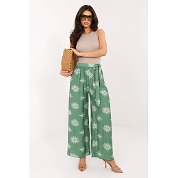 Dámske palazzo nohavice sú pohodlné a štýlové nohavice na každý deň, ideálne pre ženy, ktoré oceňujú voľnosť a módny vzhľad. Široké, dlhé nohavice dodávajú siluete ľahkosť a eleganciu a zároveň zabezpečujú maximálne pohodlie pri nosení. Model je vyrobený z kombinácie viskózy a nylonu, vďaka čomu je materiál príjemný na dotyk, priedušný a odolný. Dominantná potlač dodáva nohaviciam osobitý vzhľad a robí z nich zaujímavý prvok každého outfitu. Pas je vyrobený z elastickej látky a dodatočnej šnúrky, ktorá umožňuje ideálne prispôsobenie sa siluete a zvyšuje pohodlie pri nosení. Ide o skvelú voľbu na každodenné outfity, sviatočné aj ženské.