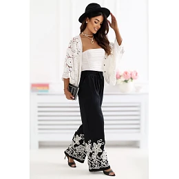 Kalhoty širokého střihu pro ženy jsou ideální nabídkou pro každodenní stylizace, spojující pohodlí s moderním, ženským vzhledem. Volný střih s širokými, dlouhými nohavicemi poskytuje volnost pohybu a lehce se skládá na postavě, vytvářející efektní, stylový vzhled. Model se vyznačuje ozdobným vyšívaním na nohavicích, které dodává celku originalitu a jemnou eleganci. Vysoký pas krásně zdůrazňuje pas, a šňůrka v pase umožňuje ideální přizpůsobení a zvyšuje pohodlí nošení. Kalhoty jsou vyrobené z prodyšné, příjemné na dotek viskózy, díky čemuž se skvěle osvědčí v každodenním používání, zejména v teplejších dnech. Praktické, boční kapsy přidávají funkčnost, aniž by narušovaly lehký charakter modelu. Jedná se o skvělou volbu pro ženy, které oceňují pohodlí, styl a unikátní detaily ve svém šatníku.