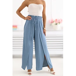 Kalhoty s širokými nohavicemi jsou skvělou volbou pro každodenní nošení pro ženy, které ocení pohodlí a moderní styl. Model s širokými a dlouhými nohavicemi se pěkně pohybuje, dodává postavě lehkost a volný charakter. Hladký vzor činí kalhoty univerzální a snadno se kombinují, skvěle ladí jak s jednoduchými tričky, tak s elegantnějšími blůzami. Nohavice s rozparkem dodávají celku jemnou lehkost a módní akcent. Šněrování v pase a jemné zvrásnění zajistí pohodlné padnutí a zdůrazní pas, zároveň dodají kalhotám zajímavějšího tvaru. Chybějící kapsy podtrhují minimalistický charakter modelu. Vyrobené z měkké a elastické směsi viskózy a elastanu, kalhoty zaručují pohodlí po celý den. Jsou to stylová a pohodlná volba ideální pro každodenní stylizace. Poznámka: Velikost na štítku M/L, ale model je menší - odpovídá velikosti S/M (menší).