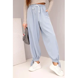Dámske nohavice so širokými nohavicami a viazaním v spodnej časti džínsovo modré