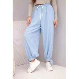 Dámske nohavice so širokými nohavicami a viazaním v spodnej časti modrej farby