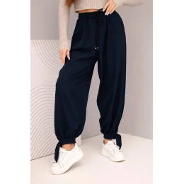 Dámske nohavice so širokými nohavicami a viazaním v spodnej časti modrej farby