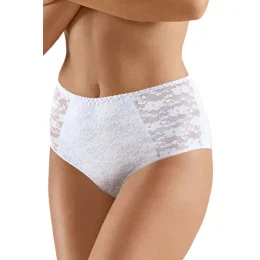 Dámske nohavičky 070 Babell - biela farba - vyšší a plnší strih - predná časť zdobená čipkou - obopínajúca látka tvaruje brucho - boky sú azúrové - zadná časť z bavlny
