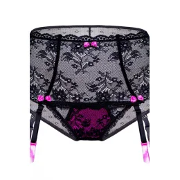 Dámske nohavičky Fifii belt ROZA - čierna farba - vyrobené z čipky s kvetinovou výšivkou - vyšší pás - odopínateľné a nastaviteľné podväzkové pásiky - zadná časť z mikrovlákna - ozdobné mašle vo fialovej farbe