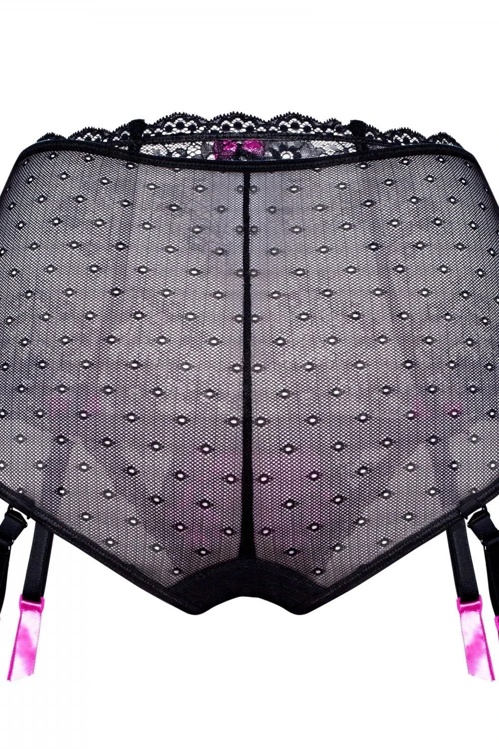 Dámske nohavičky Fifii belt ROZA - čierna farba - vyrobené z čipky s kvetinovou výšivkou - vyšší pás - odopínateľné a nastaviteľné podväzkové pásiky - zadná časť z mikrovlákna - ozdobné mašle vo fialovej farbeMateriálové zloženie: 75% polyamid + 20% elastan + 5% bavlna