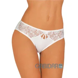 Dámske nohavičky bokového strihu od značky Gabidar. Nohavičky sú vyrobené z veľmi príjemnej bavlny a vďaka tomu sú nohavičky veľmi pohodlné. Predná časť je kombinovaná jemnou čipkou s kvetinovým vzorom a je ozdobená otvorom s mašličkou. Zadná časť je celá hladká.