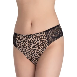 Figi LAMA w efektowny wzór panterki to propozycja dla kobiet, które cenią sobie połączenie modnego designu i komfortu noszenia. Model wykonano z miękkiej, przyjemnej w dotyku tkaniny, która idealnie dopasowuje się do sylwetki. Po bokach znajdują się wstawki z czarnej, misternie zdobionej koronki, które nadają bieliźnie elegancji i delikatności. Figi świetnie sprawdzą się zarówno na co dzień, jak i jako element stylowego kompletu z dopasowanym biustonoszem. To idealny wybór dla kobiet lubiących podkreślać swój charakter poprzez detal.